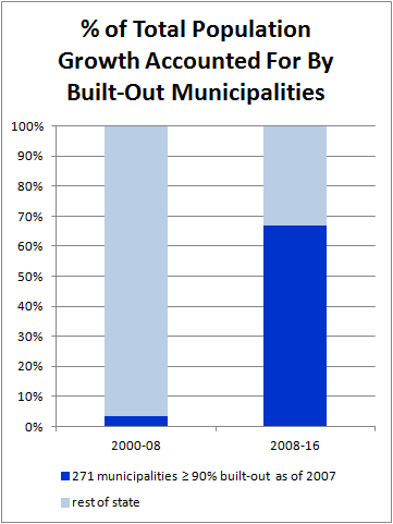 Redevelopment along the Jersey City waterfront. Source: King of Hearts via wikimedia[/caption]The Census Bureau released 2016 municipal population estimates yesterday. The new data once again illustrate that redevelopment is the new normal, with built-out places reversing decades of stagnation and sometimes outright population loss to become the primary drivers of growth in the years since the 2008 recession. This is a continuation of a trend we noted last year, and in previous years.The 271 municipalities that were at least 90 percent built out as of 2007 (meaning that they have already built on most or all of their buildable land) accounted for a full two-thirds (66.8 percent) of total statewide population growth between 2008 and 2016. This same group of municipalities only accounted for a negligible 3.6 percent of total growth between 2000 and 2008, so the post-recession turnaround is quite dramatic.