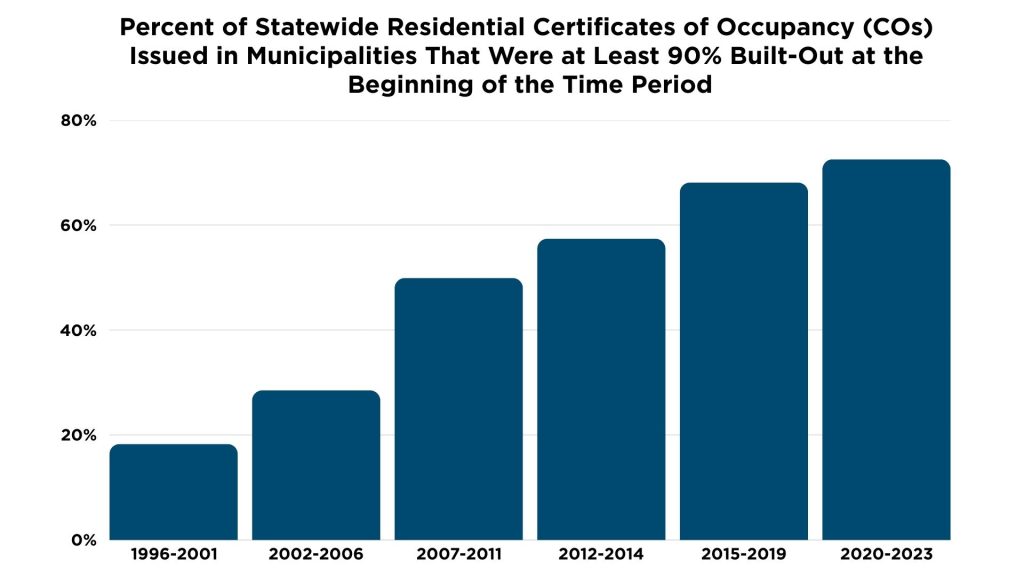 The rise in the share of housing growth happening as redevelopment is even more dramatic. The percentage of residential building activity, as measured by the issuance of residential certificates of occupancy (COs), taking place in mostly built-out places has been growing steadily since the 1990s and now accounts for more than 2/3 of residential COs statewide.