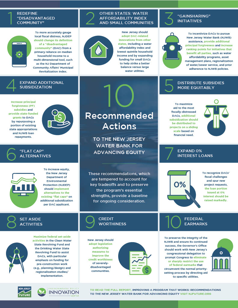The Water Bank implemented a tiered system (AC1 vs AC2) explicitly designed to provide the most beneficial packages to the most economically challenged communities. - A major expansion of technical assistance through NJDEP (NJ-TAP) and the I-Bank focused on DACs and overburdened communities