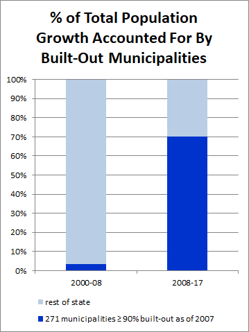 The preference for access to rail transit has also strengthened in recent decades. The 138 municipalities hosting rail transit stations made up 60.8 percent of total statewide population growth between 2008 and 2017, compared to only 14.9 percent between 2000 and 2008. By contrast, municipalities without rail transit service grew by just 2.3 percent from 2008 to 2017, and by 5.4 percent from 2000 to 2008. (This growth around transit underscores the need for New Jersey to make significant investments in transit-oriented development. A bill, A3654/S2333, that would require NJ Transit to establish an office of transit-oriented development, is a good first step.)Much of this growth has been happening as redevelopment in already-built places. The 270 municipalities that were at least 90 percent built-out as of 2007 (meaning they had developed at least 90 percent of their total supply of developable land) accounted for 70.1 percent of statewide population growth from 2008 to 2017, compared to a mere 3.6 percent from 2000 to 2008. Redevelopment has become the new normal.Many of the fastest-growing municipalities so far this decade (2010 to 2017) are places that actually lost population in at least one decade between 1970 and 2010, a period when suburban sprawl and urban disinvestment were at their peak, so the recent turnaround is a remarkable reversal of the broader post-WWII pattern of suburbanization. These revitalizing municipalities include (in descending order of population): Jersey City, Union City, Bayonne, Hoboken, West New York, Bloomfield, Kearny, Fort Lee, Garfield, Princeton, Rahway, Englewood, Cliffside Park, Cranford, Carteret, Lyndhurst, Elmwood Park, Harrison, South Orange, Clark, Weehawken, Fairview, Metuchen, New Providence, Woodland Park, Edgewater, East Rutherford, Wood-Ridge, Kenilworth, Raritan, Fanwood, Allendale, Northvale, and Englishtown. The challenge for these places is how to accommodate the new residents who are seeking the live-work-play environments they offer.