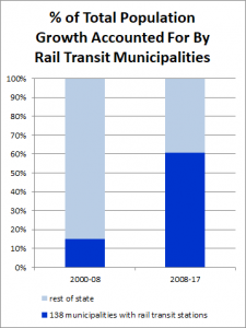 An initial analysis of the Census municipal population estimates released recently confirms that the trend back to walkable urbanism is continuing. An analysis of municipal population changes from 2016 to 2017 against New Jersey Future’s three “smart-growth metrics” — net activity density, presence of a mixed-use “center,” and local street network density — show that as a group, the 124 municipalities that score well on all three metrics grew faster than did the state overall, growing by 0.5 percent compared to 0.3 percent for the state.These municipalities have accounted for 61.5 percent of statewide population growth from 2008 to 2017, after having accounted for only 6.1 percent of growth from 2000 to 2008. In contrast, municipalities not scoring well on any of the metrics saw their share of growth decline from 38.8 percent for the 2000-2008 period to just 11.9 percent for 2008-2017.The renewed interest in these places is being fueled by the Millennial generation, who, based on New Jersey Future’s demographic analysis last year, evidenced a pronounced preference for compact, walkable places. As Millennials have entered young adulthood and moved out on their own, they have gravitated toward the state’s cities, smaller downtowns, and older, walkable suburbs.